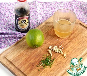 В это время подготовить ингредиенты для соуса. Чеснок очистить, мелко нарезать. Лук зеленый тоже нарезать мелко.