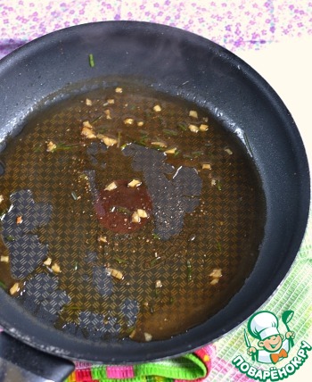 В сковороде нагреть оставшееся масло - 1 ст. л. Добавить чеснок и лук, жарить около минуты. Затем влить бульон, соевый соус. Перемешать и томить около 0,5-1 минуты.