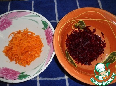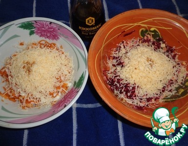 Белок натереть на крупной терке и добавить в морковь. Желток на крупной терке в свеклу.