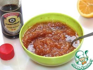 • Добавьте яблочное пюре, соевый соус, томатный соус, растительное масло, всыпьте специи. Поставьте сотейник на огонь и подогрейте маринад, но не доводите до кипения. Добавьте соус табаско и перемешайте.