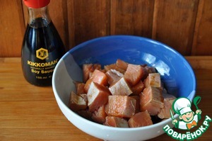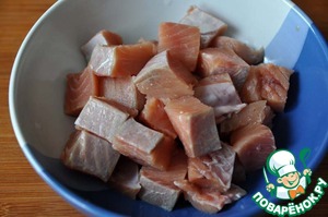 Берём лосось, у меня кета. Разделываем на филе, режем на кусочки размером 1-1,5 см.