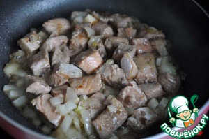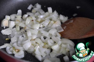 По истечении указанного времени, лук нарезаем мелкими кубиками и обжариваем на растительном масле до прозрачности.