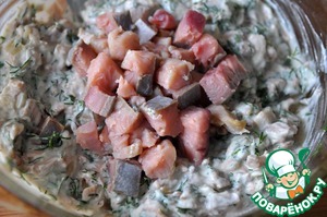 Добавляем в начинку малосольный лосось (у меня кета), порезанный на мелкие кусочки, перемешиваем.