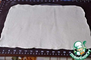 Берём тесто, раскатываем в прямоугольник толщиной 2 мм. Тесто очень поддатливое в работе, даже не потребовалось муки на подсыпку.