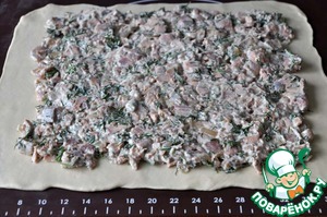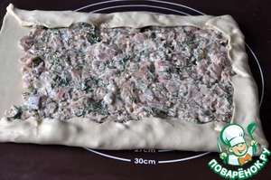 Кладём на тесто начинку, разравниваем, оставляя приблизительно по 3 см от всех краёв.