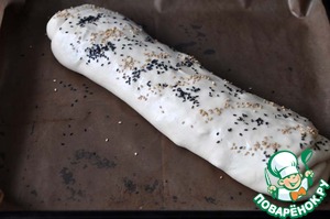 Смазываем рулет белком, посыпаем кунжутом.