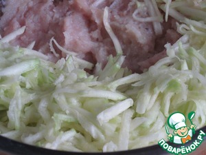 Куриное мясо пропустим через мясорубку вместе с луком. Очищенный кабачок натрем на крупной терке, смешаем с куриным фаршем.