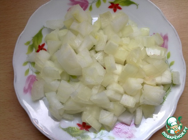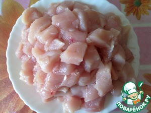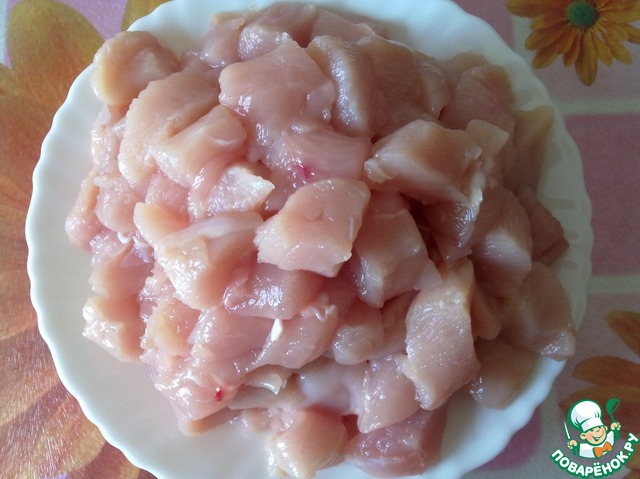 • Филе куриное порезать маленькими кубиками и обжарить на растительном масле до полной готовности.