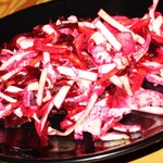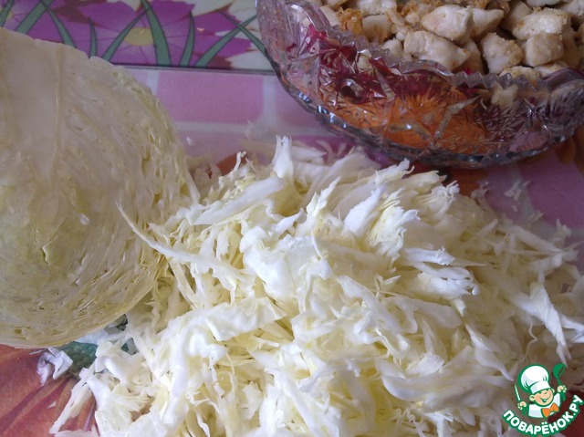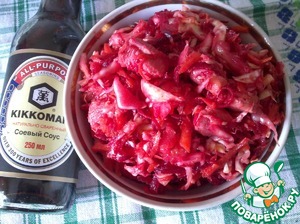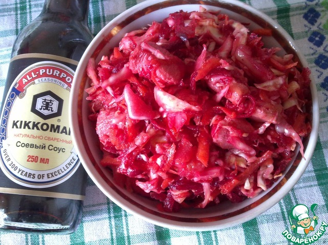 • Соединяем все ингредиенты: морковь, свеклу, лук, капусту, куриное мясо и картофель и хорошо перемешиваем. Поперчить и добавить соль по вкусу. Полить салат соевым соусом" Kikkoman" и еще раз перемешать.