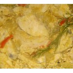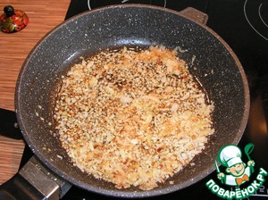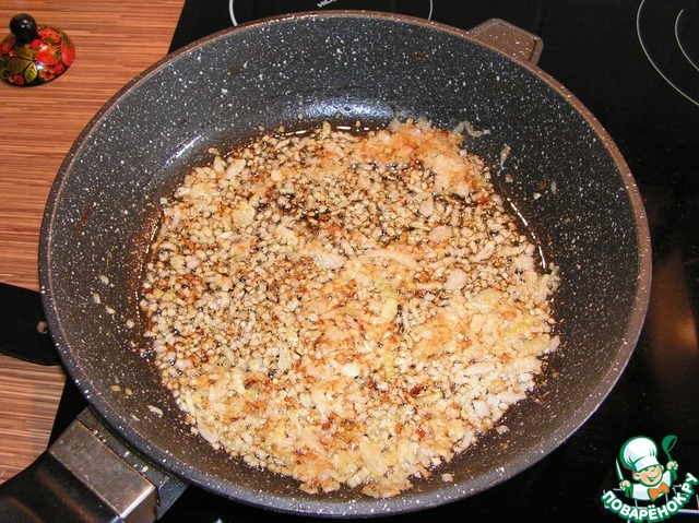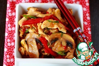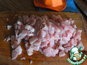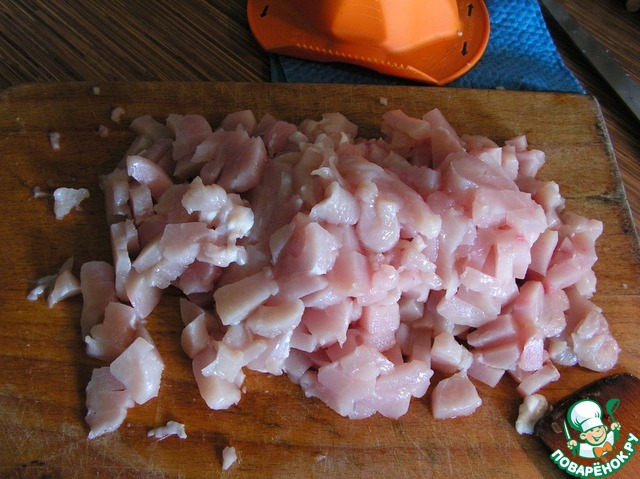 Пока обжаривается лук, нужно быстренько порезать куриные грудки на маленькие кусочки, скажем 1*1 см (чуть меньше чуть больше - роли не играет) и как только лук приобрел золотистый цвет, добавляем нарезанную грудку к луку. Обжариваем это все очень быстро на очень сильном огне, буквально 2-3 минуты. И отставляем в сторону. Солим, перчим