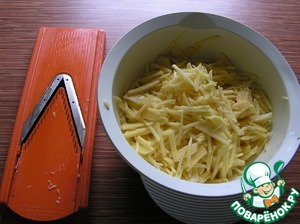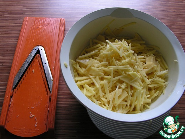 Натираем картошку. Для этого идеально подходит так называемая V-терка. У меня это старинный Börner ))) солим, перчим