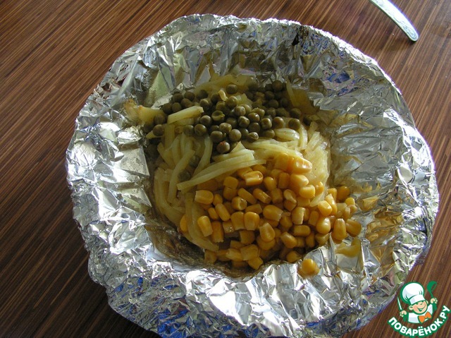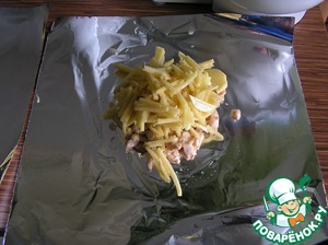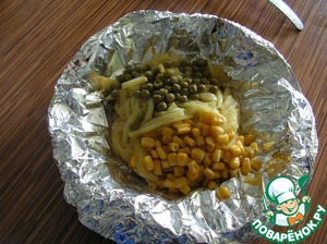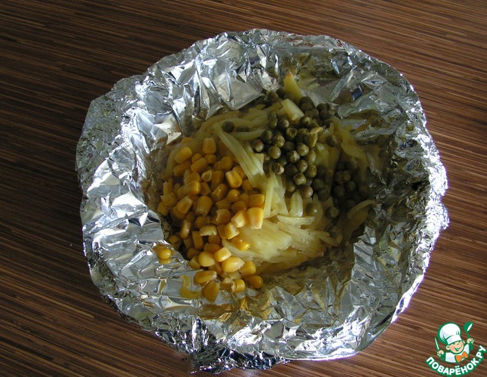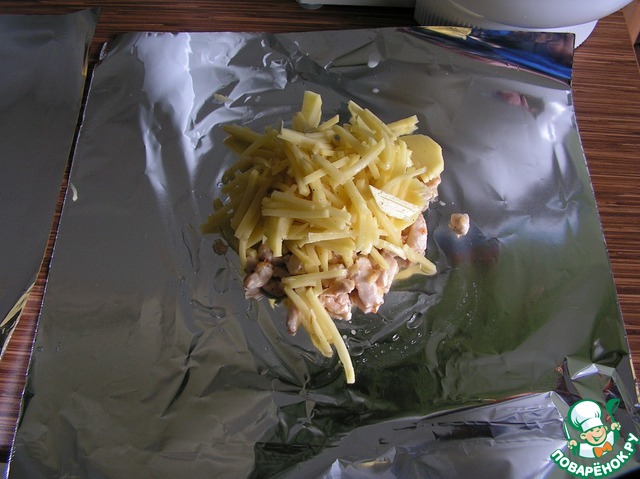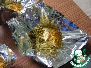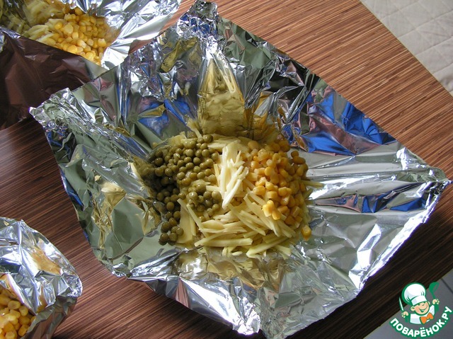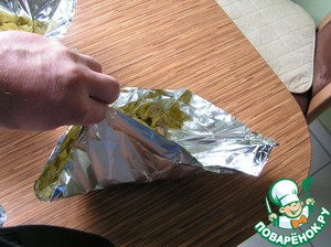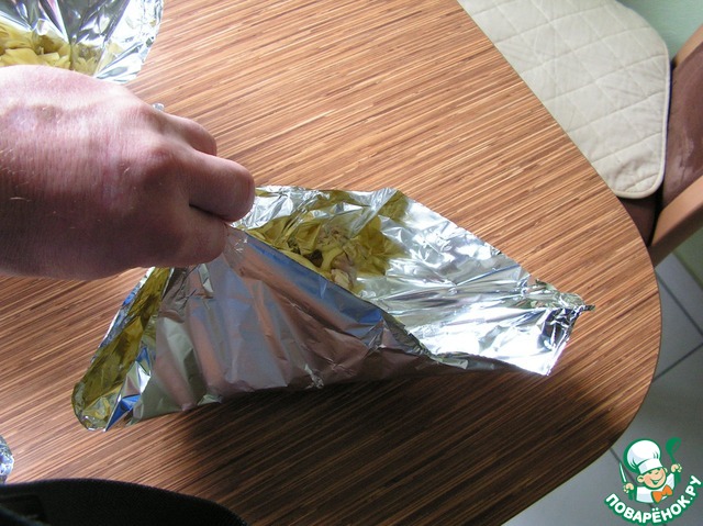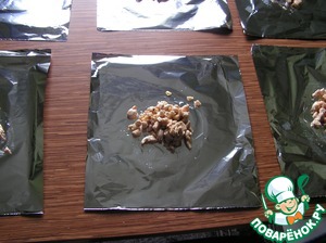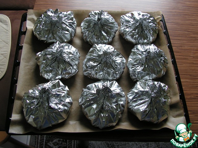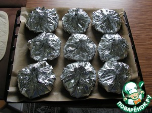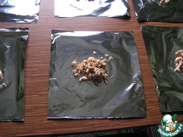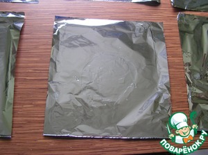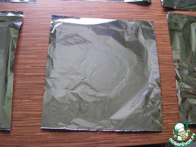 Нарезаем фольгу квадратами примерно 30*30 см (9шт - вместимость моего поддона для духовки). Блестящей стороной наверх и смазываем немного маслом.