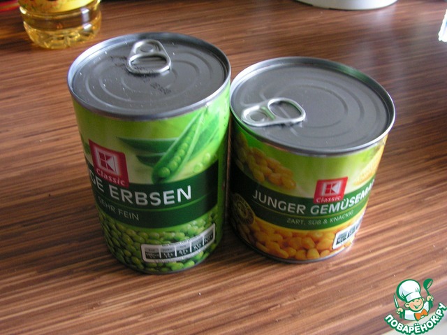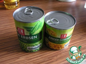 Открываем кукурузу и горошек, сливаем воду (я всегда оставляю по чуть чуть)...!!! Как вариант: я иногда беру замороженную смесь овощей (Buttergemüse).