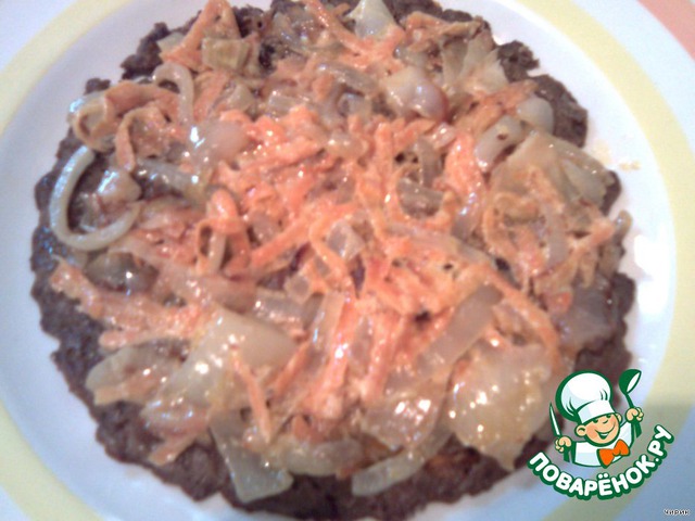 Когда первый корж готов, выкладываем его на тарелку, смазываем морковно-луковой начинкой и печём следующий корж