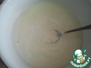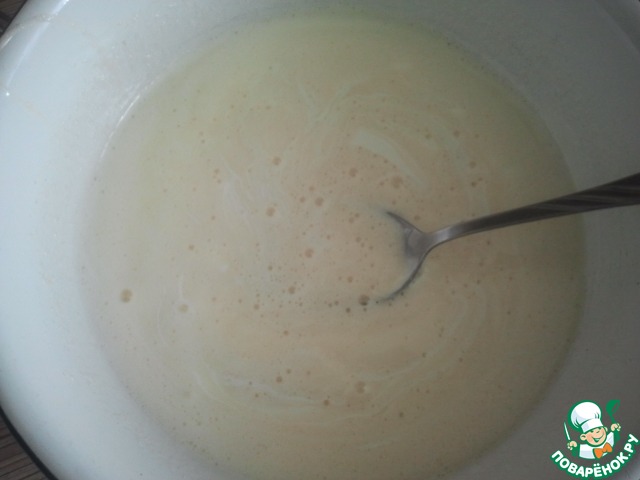 • В сметану добавляем соду, размешиваем и все это добавляем к яично-сахарной смеси. Вымешиваем аккуратно ложкой, миксером больше не пользуемся.