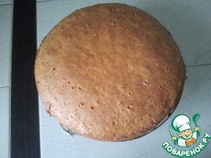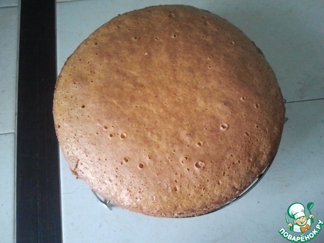 • Получили вот такой корж, который разрезаем на две половинки и еще горячие пропитываем сиропом из консервированных персиков. Даем остыть.