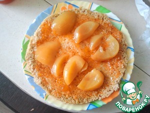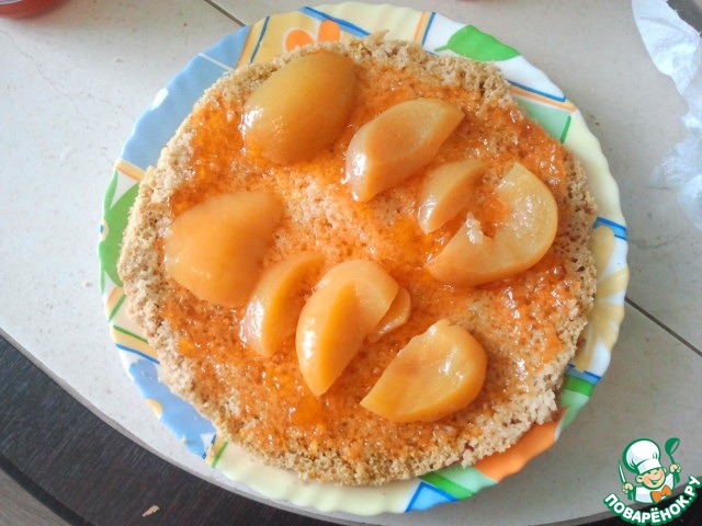 • Когда коржи остыли, собираем торт. Сначала аккуратно обрезаем коржи, обрезки пойдут на украшение. Нижний корж намазываем абрикосовым джемом (хотелось для гармонии персиковый, но не нашла), кладем сверху разрезанные половинки персиков.