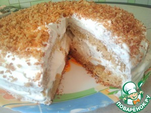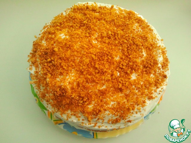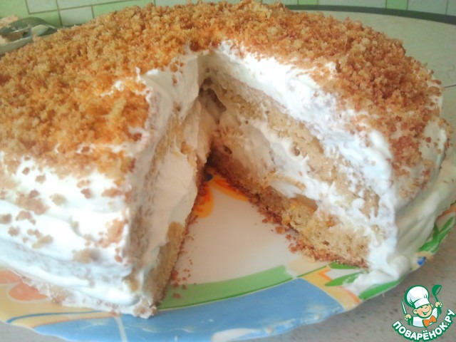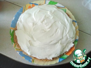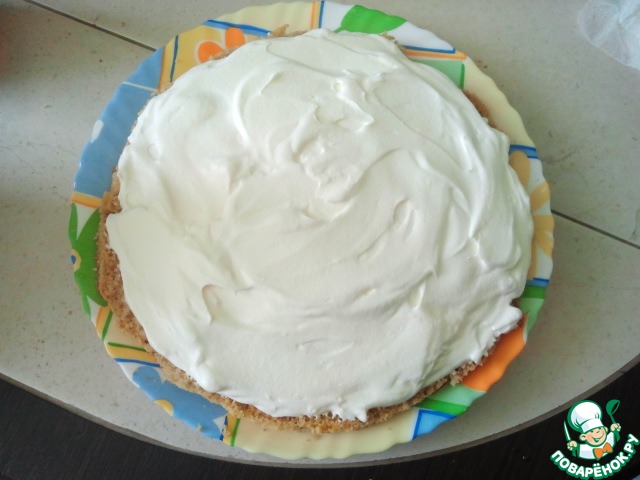 • Верхний корж тоже намазываем сливками, посыпаем крошкой из обрезков торта. Собранный торт отправляем в холодильник, пропитываться.