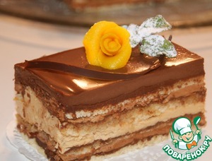 Ну и последний критичный момент - у меня нет прямоугольной рамки, поэтому я просто обрезала края готового торта ножом. Все обрезанные кусочки я аккуратно приложила по бокам (там где были неровности или пустоты) и замазала остатками крема. А когда поливала глазурью, то она равномерно растеклась сверху, а все что полилось на поднос, я аккуратно собрала, обмазала по бокам, и весь торт получился в "шоколаде"!