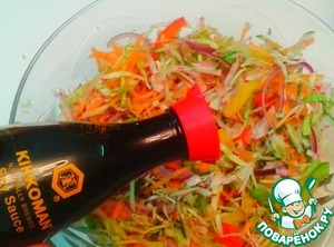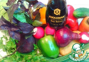 Дорогие поварята, предлагаю вам приготовить салат из одних овощей и зелени. Салат не солержит соли и масла. Заправлять овощи мы будем соевым соусом фирмы Kikkoman.