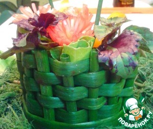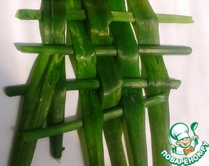Дорогие поварята! Специально для вас хочу показать принцип плетения корзины. Лук разрезать вдоль и развернуть. Прижать чем-нибудь тяжелым. Если не хватило луковой лозы-прибавить, вкладывая ее в два предыдущих кармана. Перенести плетенку на изделие и концы так же убрать в начальные карманы. Это можно сделать при помощи чего-нибудь тонкого. Лозы хорошо держарся на салате. Лишнее обрезать маникюрными ножницами.