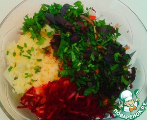 В маринованные овощи выкладываем тертые картофель и свеклу. Добавляем измельченную зелень. Перемешиваем. Салат готов! Его можно взять на пикник и угостить им вашу семью и ваших друзей! А я для вас украшу салат зеленью.