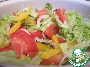 Все овощи помоем и нарежем - сладкий перец не очень длинными полосками, помидоры - ломтиками, огурцы - четвертинками или половинками кружков, лук - тонкими полукольцами. Салат тоже нарезать или порвать руками.