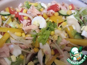 Добавим кукурузу, тунец и яйца, нарезанные ломтиками.