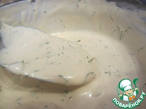 Заправка-соус. У веточек базилика оторвем листики и нарежем мелко вместе с укропом. Смешиваем сметану, майонез, горчицу, кетчуп, винный уксус и зелень. Солим и перчим по вкусу. Повторюсь, эту великолепную заправку можно использовать и для других салатов, и как самостоятельный соус. Очень рекомендую!