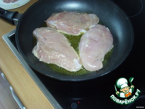 Оставшееся масло нагреваем в сковороде и обжариваем грудки с обеих сторон 3-4 мин.