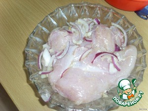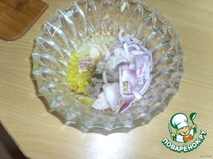 сок лимона, 30мл оливкового масла, нарезаем лук, чеснок. Добавляем соль, перец, и всё перемешиваем. -