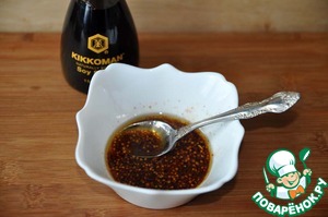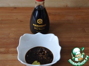 Берём соевый соус от ТМ Киккоман (2 ст. ложки), добавляем оливковое масло (2 ст. ложки), тёртый имбирь, измельчённый чеснок, свежемолотую смесь перцев. Всё перемешиваем.