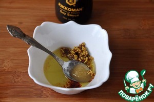 Соединяем французскую горчицу с зёрнами, оливковое масло (2 ст. ложки), красный кайенский перец, мёд. -