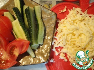 Моцареллу (или сулугуни, в крайнем случае - любой твердый сыр) трем на крупной терке, огурец режем брусочками, а помидор ломтиками - по количеству отбивных. Все это должно быть подготовлено к началу приготовления куриного филе.