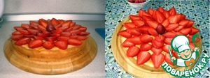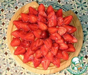 Нарезаем клубнику пластинками, выкладываем на корж.