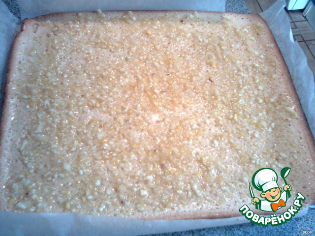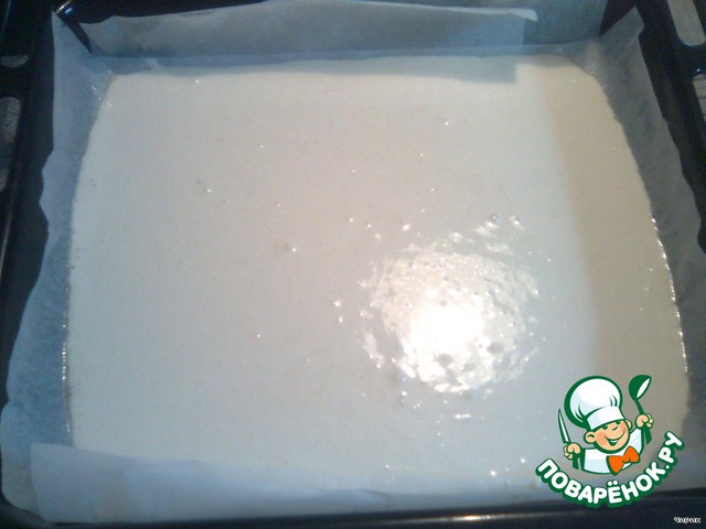 Тесто вылить на противень, устланный промасленной пергаментной бумагой, разровнять и поставить в прогретую до 180С духовку на 20 минут