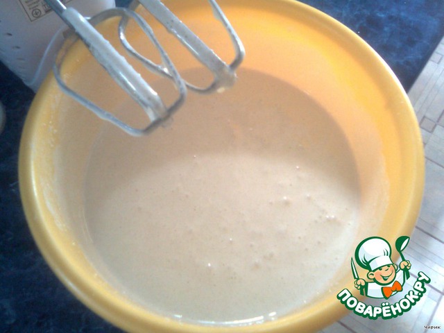 Отделить белки от желтков, взбить белки с 1 стаканом сахара до крутой пены, добавить желтки, муку и взбивать до однородной массы 1 минуту