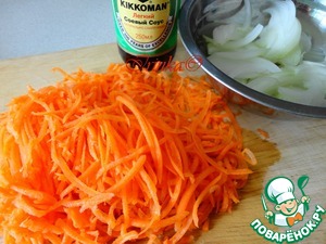 Затем добавляем соевый соус и перемешиваем. Пробуем на соль. Если надо-подсаливаем. Сильно не увлекайтесь, потому что в холодном виде будет солонее.