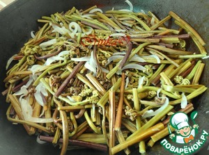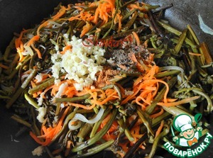 В отдельной сковороде раскаляем оставшееся масло до дымка, заливаем им папоротник с морковкой и специями, быстро накрываем крышкой и встряхиваем.