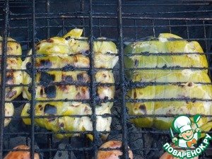 За счет сочной начинки и листьев которые удерживают сок внутри при жарке, рыба получается сочной с ароматом дымка.