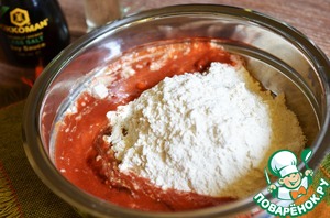 Томатную пасту размешать в 180 мл. воды. Получившийся сок влить в муку, добавить соевый соус и растительное масло. Замесить тесто как на пельмени.