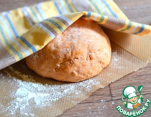 Тесто замечательно замешивается и с ним легко работать. (Возможно, вам понадобится муки больше, всё зависит от сорта). Оно будет красивого оранжево-персикового цвета.