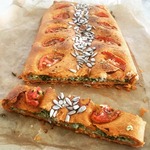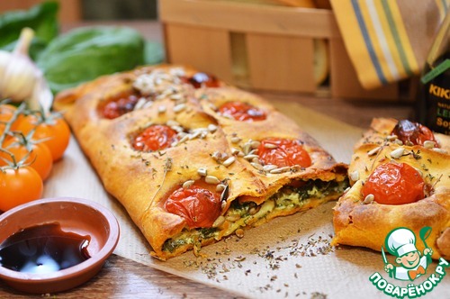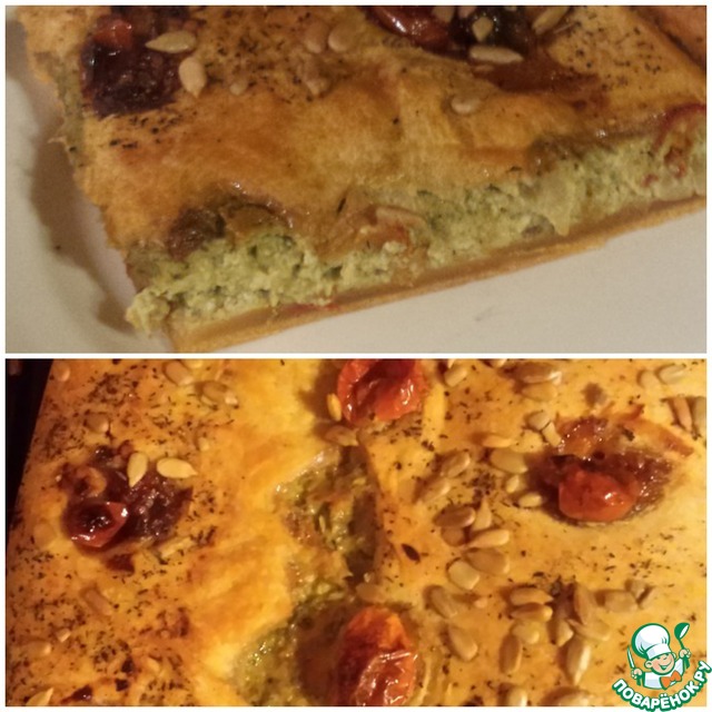 В дырочки вложить помидоры черри, разрезанные на пополам, разрезом вниз. При выпекании сок с них будет стекать в пирог и именно это место, где помидор, будет самым вкусным. Верх пирога смазать растительным маслом.