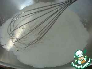 В большой миске взбить венчиком вместе муку, пищевую соду и соль.