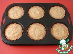 Заполнить тестом бумажные формочки для кексов, установленные в жесткую форму. Удобно это делать ложкой для мороженого. Можно использовать силиконовые формы для кексов или металлические, тогда их необходимо смазать маслом.