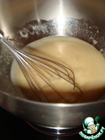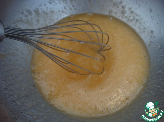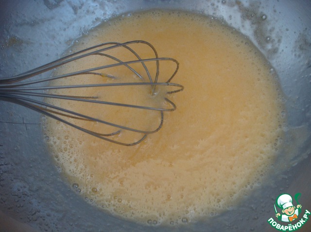 Для этого в жаропрочной миске слегка взбить венчиком 2 яйца и 100 г сахара. -