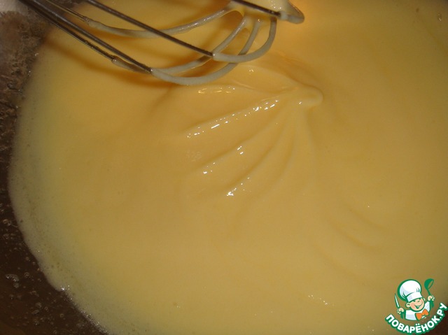Установить миску на кастрюлю с кипящей водой так, чтобы донышко не касалось воды и, постоянно помешивая резиновым шпателем или деревянной ложкой (чтобы предотвратить свертывание), варить до тех пор, пока смесь не станет густой, как сметана (до 70 градусов С). Это займет около 10 минут.