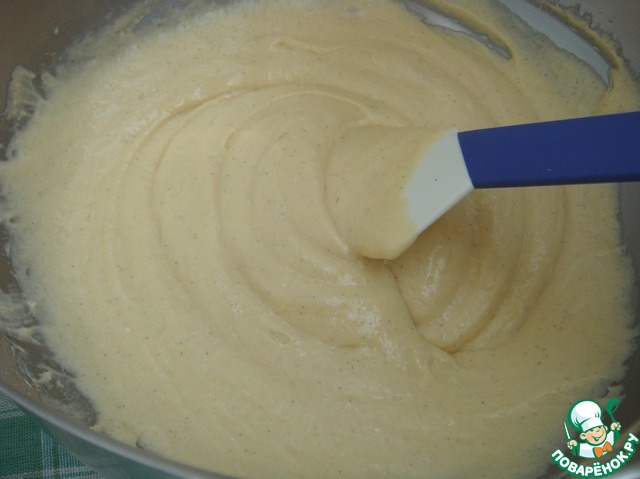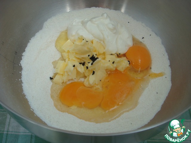 Добавить к мучной смеси 115 г масла, 2 яйца, мякоть одного стручка ванили и сметану.