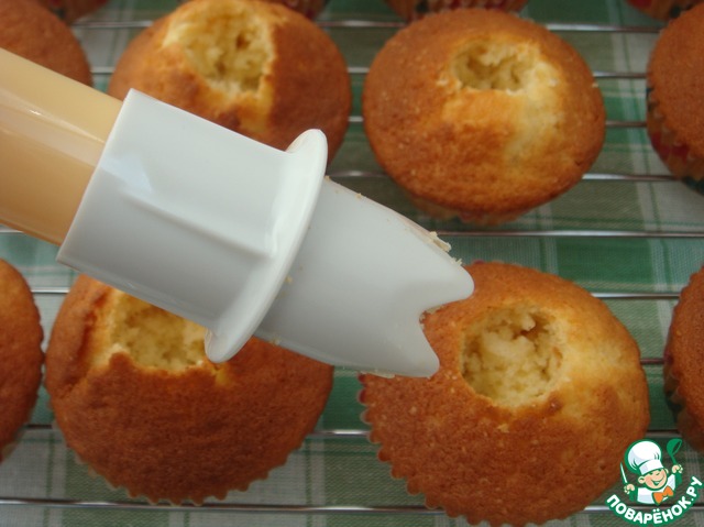 После того, как кексы остыли полностью, вырезать небольшое (1,5 см) отверстие в центре каждого кекса, удобно для этого использовать ложку для дыни или просто чайную ложку.