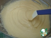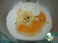Добавить к мучной смеси 115 г масла, 2 яйца, мякоть одного стручка ванили и сметану. |